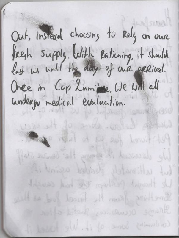 A crewman jumped overboard in the early hours of the morning, claiming we are cursed. We tried to stop him, but it was as if he had been more fearful of us than of the waters below. Some of the crew petitioned for us to turn around. We discussed it among the senior staff but ultimately decided against it. We thought perhaps we had caught something from the tinned food, as these strange occurrences started after consuming some of it. We tossed it out, instead choosing to rely on our fresh supply. With rationing, it should last us until the day of our arrival. Once in Cap Lumière, we will all undergo medical evaluation.