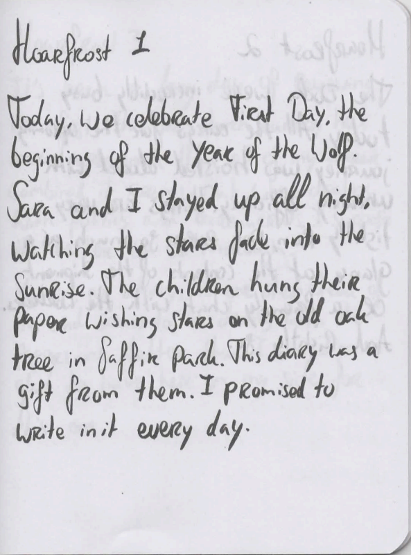 Today, we celebrate First Day, the beginning of the Year of the Wolf. Sara and I stayed up all night, watching the stars fade into the sunrise. The children hung their paper wishing stars on the old oak tree in Saffir Park. This diary was a gift from them. I promised to write in it every day.