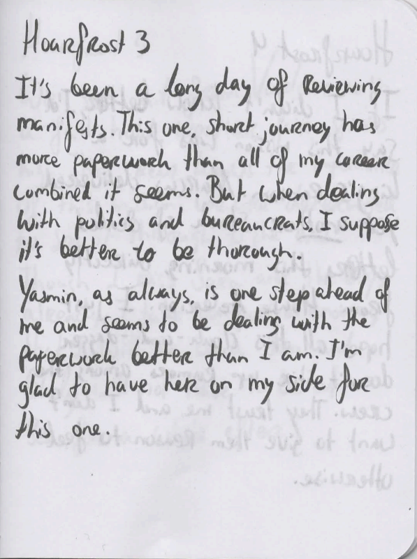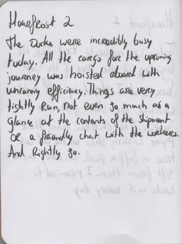 The docks were incredibly busy today. All the cargo for the upcoming journey was hoisted aboard with uncanny efficiency. Things are very tightly run, not even so much as a glance at the contents of the shipment or a friendly chat with the workers. And rightly so.