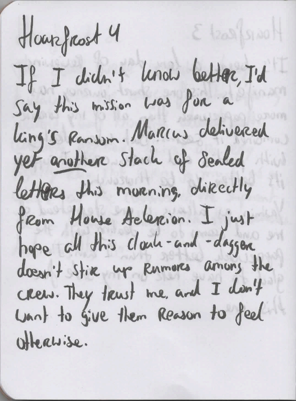 If I didn’t know better, I’d say this mission was for a king’s ransom. Marcus delivered yet another stack of sealed letters this morning, directly from House Aelerion. I just hope all this cloak-and-dagger doesn’t stir up rumors among the crew. They trust me, and I don’t want to give them a reason to feel otherwise.