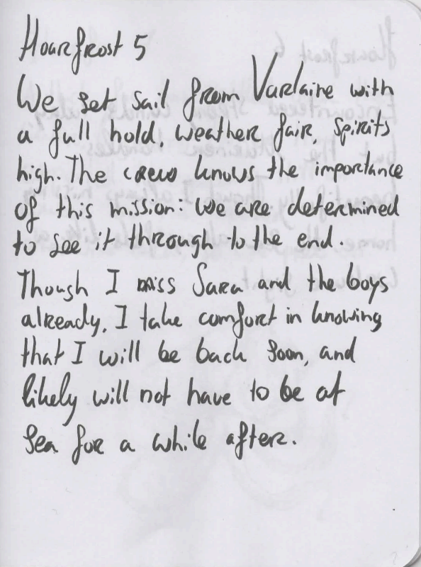 We set sail from Varlaine with a full hold, weather fair, spirits high. The crew knows the importance of this mission: we are determined to see it through to the end.