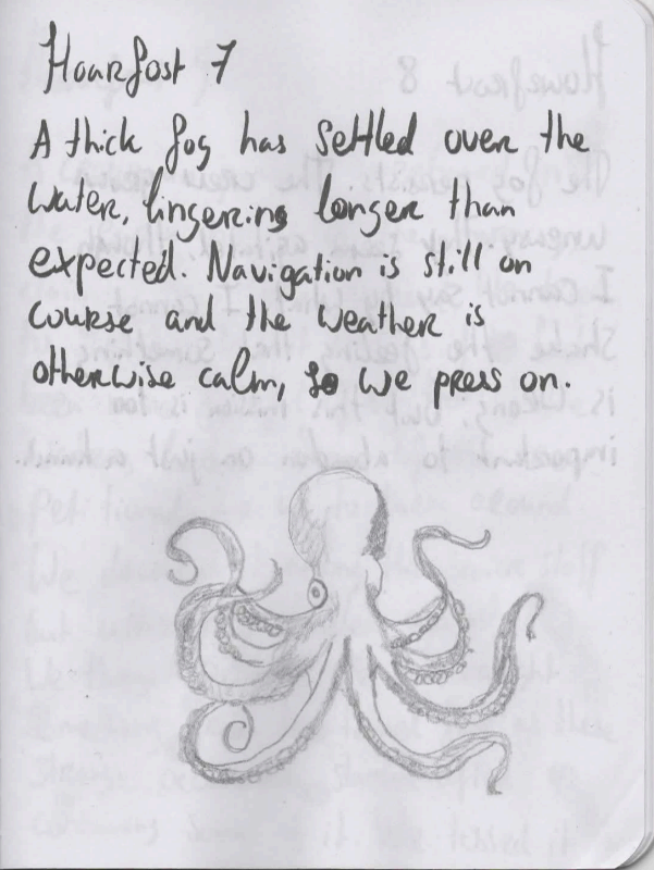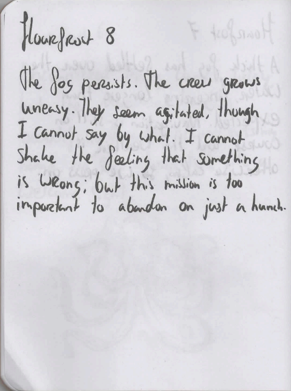 The fog persists. The crew grows uneasy. They seem agitated, though I cannot say by what. I cannot shake the feeling that something is wrong; but this mission is too important to abandon on just a hunch.