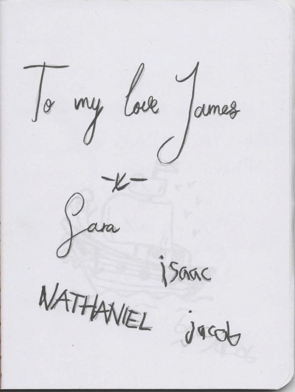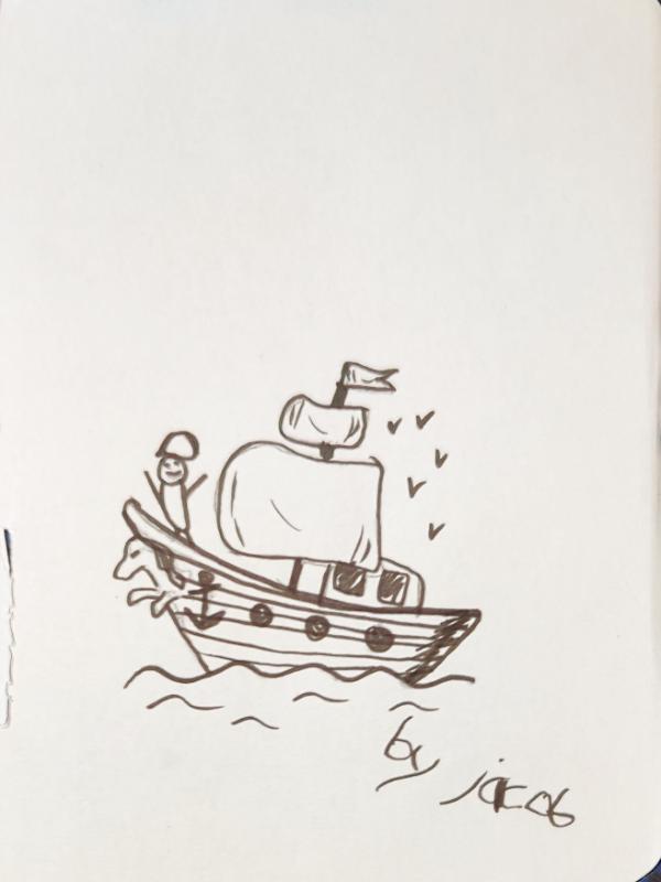 The diary contains a drawing of a sailboat braving the sea, with a person wearing a captains hat on the bow of the ship. The drawing is signed “by jacob”.
